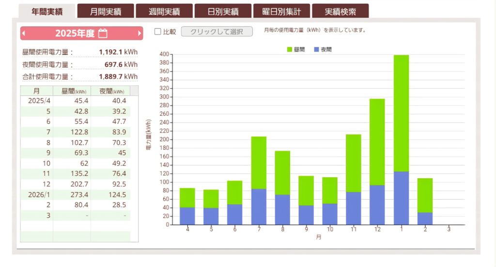 まずは、絶望の始まりとなったうちの電気使用量の推移(2025年〜)をご覧ください。